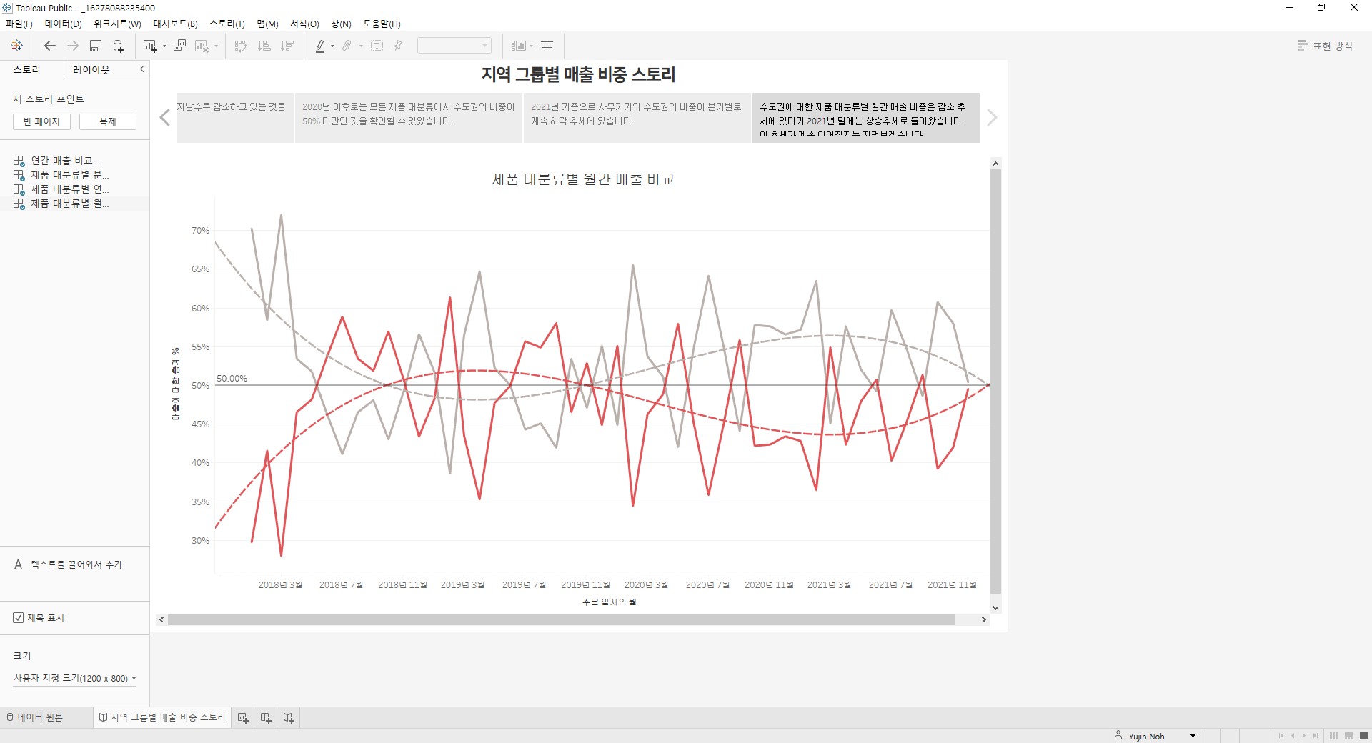 태블로의 장점은 데이터 형식과 차원에 따라 추천하는 차트가 자동 적용이 되고 드래그 앤 드랍으로 손쉽게 시각화를 할 수 있다. 실제로 사용해 봤을 때, 왜 태블로가 시각화 분야에서 많이 쓰이는지 알 수 있다. UI가 이쁘고 직관적이여서 금방 손쉽게 차트를 만들 수 있다.